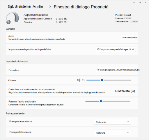 Windows offre accessibilità avanzata abilitando l'associazione diretta e lo streaming audio per i dispositivi di assistive hearing supportati da Bluetooth® Low Energy Audio (LE Audio) su PC compatibili. Questo aggiornamento introduce nuove funzionalità per i set di impostazioni audio e il controllo del suono ambientale, accessibili direttamente da Impostazioni o Impostazioni rapide in Windows. Gli utenti possono modificare le impostazioni del dispositivo di assistive hearing in base al proprio ambiente, anche se le opzioni variano in base al modello e alla configurazione del dispositivo.