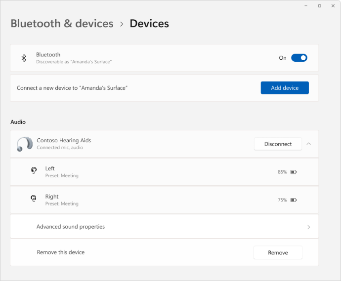 Anche la pagina delle impostazioni di Bluetooth e dispositivi è stata migliorata per offrire più funzionalità. Gli utenti possono ora visualizzare dettagli essenziali per i dispositivi Bluetooth connessi, ad esempio durata della batteria e stato della connessione, e accedere con facilità alle impostazioni audio per i dispositivi audio. Questi miglioramenti si applicano agli apparecchi acustici e a tutti gli altri dispositivi elencati in questa pagina.