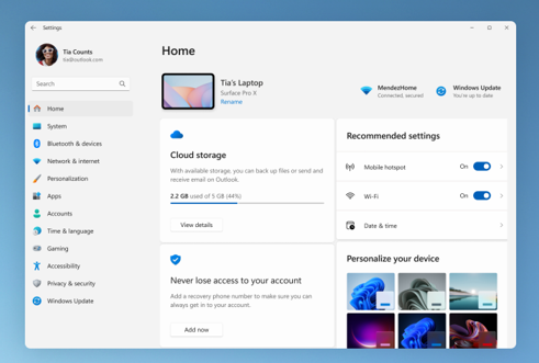 - Un pratico pulsante Aggiungi ora è disponibile in Impostazioni > Account. Usalo per aggiungere rapidamente un indirizzo e-mail di ripristino al tuo account Microsoft, in modo da assicurarti di non perdere mai l'accesso. Questa opzione viene visualizzata quando accedi con il tuo account Microsoft