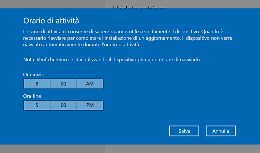 Potrebbe essere occasionalmente necessario riavviare il PC per completare l'installazione degli aggiornamenti. Puoi impostare l'orario di attività per far sapere a Microsoft quando usi in genere il PC ed evitare che tali riavvii vengano eseguiti nel momento meno opportuno.