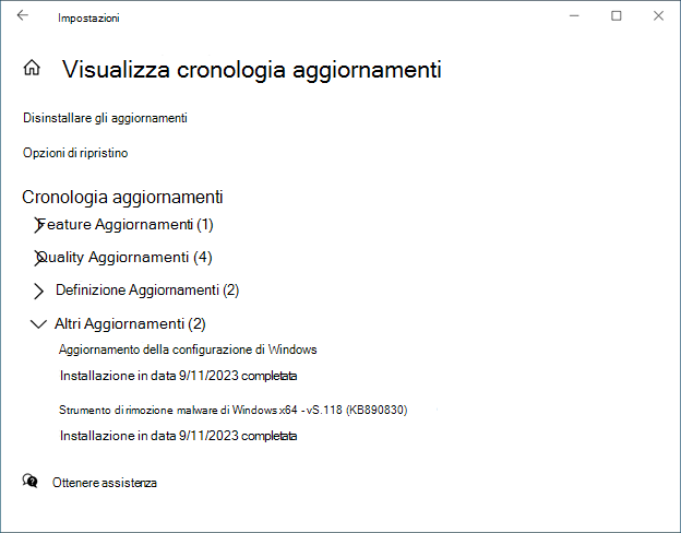 Per saperne di più sugli aggiornamenti installati, seleziona Start > Settings > Windows Update > Update history. Per informazioni sulle modifiche alla configurazione, espandi la sezione Altri aggiornamenti e seleziona il collegamento Altre informazioni accanto all'ultimo aggiornamento di configurazione di Windows per vedere quali miglioramenti sono stati apportati nell'ambito dell'aggiornamento.